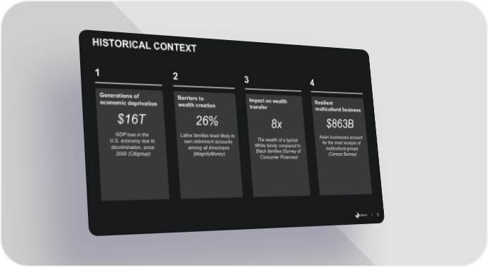 HISTORICAL CONTEXT 1 2 3 4 Generations of Barriers to Impact on wealth Resilient economic deprivation wealth creation transfer multicultural business $16T 26% 8x $863B GDP loss in the Latinx families least likely to The wealth of a typical Asian businesses account U.S. economy due to own retirement accounts White family compared to for the most receipts of discrimination, since among all Americans Black families (Survey of multicultural groups 2000(Citigroup) (MagnifyMoney) Consumer Finances) (Census Bureau) 3
