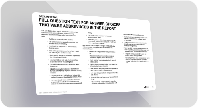DATA IN DETAIL FULL QUESTION TEXT FOR ANSWER CHOICES THAT WERE ABBREVIATED IN THE REPORT Q32. Now thinking about specific sectors of financial services, money discrimination into their application process how much do you agree or disagree with the following • I frequently do not understand the terms and • I feel that the factors that mortgage lenders use to statements about banks? Please select one response for phrases used by banks determine credit worthiness are biased against each. various groups • I feel that my bank really cares about me • I am willing to travel (drive, take a bus, etc.) further distances or go out of my way to get to a bank that I • I think there is systemic bias and discrimination • The communications I receive from my bank lack have a good relationship with towards certain groups of people within the empathy or cultural sensitivity Q34. How much do you agree or disagree with the following mortgage lending industry • I feel I could go to my bank if I needed reliable statements about mortgage lenders? Please select one • I am more likely to trust a mortgage lender when I financial advice response for each. know they actually understand and can relate to my • I feel as though employees at banks have treated • I feel that my mortgage lender really cares about financial situation and experiences with money me differently due to what I look like me • I frequently do not understand the terms and • I feel I need to change my behavior or appearance • The communications I receive from mortgage phrases used by mortgage lenders when interacting with banks lenders lack empathy or cultural sensitivity • I am willing to travel (drive, take a bus, etc.) further • I am more likely to work with a bank when I see • I feel I could go to a mortgage lender if I needed distances or go out of my way to work with a people who look like me working there reliable advice mortgage lender that I have a good relationship with • I have felt that an employee at a bank has talked • I feel as though mortgage lenders have treated me down to me differently due to what I look like • I think there is systemic bias and discrimination • I feel I need to change my behavior or appearance towards certain groups of people within the banking when interacting with a mortgage lender industry • I am more likely to work with mortgage lenders that • I feel that the factors that banks use to determine look like me creditworthiness are biased against various groups • I have felt that a mortgage lender has talked down • I am more likely to trust a bank when I know that to me employees there actually understand and can • When mortgage lenders use credit scores to relate to my financial situation and experiences with determine loan eligibility, it introduces bias and 36 2021 Edelman Money in Color Special Report