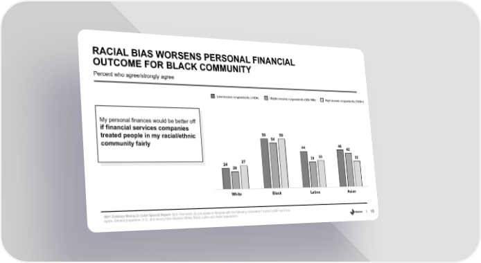 RACIAL BIAS WORSENS PERSONAL FINANCIAL OUTCOME FOR BLACK COMMUNITY Percent who agree/strongly agree Low income respondents (<50k) Middle income respondents (50k-99k) High income respondents (100k+) My personal finances would be better off if financial services companies treated people in my racial/ethnic 59 54 59 community fairly 44 46 42 31 33 32 24 27 20 White Black Latinx Asian 2021 Edelman Money in Color Special Report. Q24. How much do you agree or disagree with the following statements? 4-point scale; top 2 box, agree. General population, U.S., and among Non-Hispanic White, Black, Latinx and Asian populations. 15
