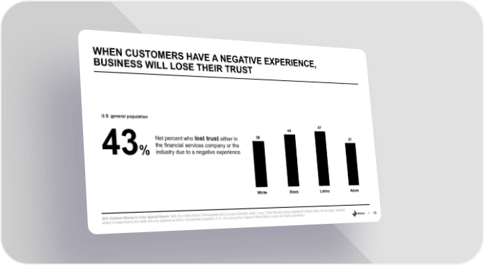 WHEN CUSTOMERS HAVE A NEGATIVE EXPERIENCE, BUSINESS WILL LOSE THEIR TRUST U.S. general population 44 47 Net percent who lost trust either in 38 37 the financial services company or the 43%industry due to a negative experience White Black Latinx Asian 2021 Edelman Money in Color Special Report. Q40. As a direct result of the experience(s) you just indicated, which, if any, of the following things happened? Please select all that apply. Question asked of respondents who dealt with any experience (Q39/1-12) General population, U.S., and among Non-Hispanic White, Black, Latinx and Asian populations. 16
