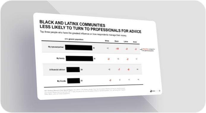 BLACKAND LATINX COMMUNITIES LESS LIKELY TO TURN TO PROFESSIONALS FOR ADVICE Top three people who have the greatest influence on how respondents manage their money U.S. general population White Black Latinx Asian My spouse/partner 51 +2 -10 -2 -3 Disparities compared to the general population My family 51 -2 +3 -2 +7 A financial advisor 24 +2 -7 -8 +4 My friends 23 -2 0 +1 +4 2021 Edelman Money in Color Special Report. Q12. Which of the following people, if any, has the greatest influence on how you currently manage your money? Please rank the top three, with “1” being the person who has the greatest influence. General population, U.S., and among Non-Hispanic White, Black, Latinx and Asian populations. 22