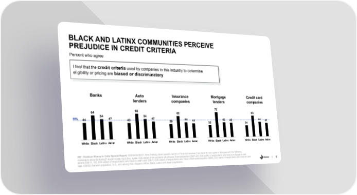BLACK AND LATINX COMMUNITIES PERCEIVE PREJUDICE INCREDIT CRITERIA Percent who agree I feel that the credit criteria used by companies in this industry to determine eligibility or pricing are biased or discriminatory Banks Auto Insurance Mortgage Credit card lenders companies lenders companies 64 68 73 54 54 62 63 50% 44 47 43 47 39 44 41 43 42 44 41 35 34 White Black Latinx Asian White Black Latinx Asian White Black Latinx Asian White Black Latinx Asian White Black Latinx Asian 2021 Edelman Money in Color Special Report. Q32/34/35/36/37. Now thinking about specific sectors of financial services, how much do you agree or disagree with the following statements about [industry]? 4-point scale; top 2 box, agree. Q32 asked of respondents who have a financial product (Q8/1-23), Q34 asked of respondents who have a mortgage or real estate (Q8/11, 18), Q35 asked of respondents who have a credit card (Q8/1), Q36 asked of respondents who have a life insurance policy (Q8/9), Q37 asked of respondents who have an auto loan (Q8/22) General population, U.S., and among Non-Hispanic White, Black, Latinx and Asian populations. 9