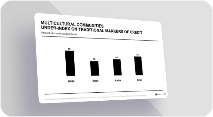 MULTICULTURAL COMMUNITIES UNDER-INDEX ON TRADITIONAL MARKERS OF CREDIT White Black Latinx Asian Percent who have bought a home 66 54 39 45 2021 Edelman Money in Color Special Report. Q4: How old were you when you first…? General population, U.S., and among Non-Hispanic White, Black, Latinx and Asian populations. 20