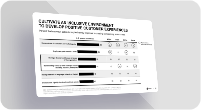 CULTIVATE AN INCLUSIVE ENVIRONMENT TO DEVELOP POSITIVE CUSTOMER EXPERIENCES Percent that say each action is very/extremely important to creating a welcoming environment U.S. general population White Black Latinx Asian Top 2 solutions within each community Communicate all customers are treated equally 66 64 71 67 68 Employees greet me with a smile 58 58 61 58 55 Having a diverse workforce at all levels 52 50 67 52 55 of the organization Implementing company-wide trainings around 51 47 69 54 57 diversity, inclusion, and equity Having materials in languages other than English 42 40 53 48 44 Demonstrate allyship for disenfranchised groups 41 39 55 45 44 2021 Edelman Money in Color Special Report. Q48. In your opinion, how important are each of the following actions when it comes to creating a more welcoming environment within the financial services industry? 5-point scale; top 2 box, important. General population, U.S., and among Non- Hispanic White, Black, Latinx and Asian populations. 32