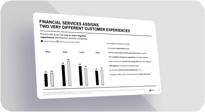 FINANCIAL SERVICES ASSIGNS TWO VERY DIFFERENT CUSTOMER EXPERIENCES Percent who have had one or more negative experiences with financial services companies General population High income respondents (100k+) List of negative experiences include: An employee talked down to me White Black Latinx Asian I felt that no one there cared to get to know me as a person I felt I needed to change my appearance to be taken seriously 68 I had to supply more proof of my employment than was necessary 58 55 49 I felt ignored or not seen at a physical location 41 44 34 36 No one had a similar cultural background to me I was given higher rates or fees because of the color of my skin 2021 Edelman Money in Color Special Report Q39. Which of the following, if any, have you experienced dealing with financial services companies before? Please select all that apply. General population, U.S., and among Non-Hispanic White, Black, Latinx and Asian populations. 12