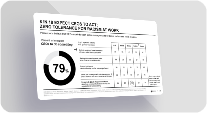 8 IN 10 EXPECT CEOS TO ACT; ZERO TOLERANCE FOR RACISM AT WORK Percent who believe that CEOs must do each action in response to systemic racism and racial injustice Percent who expect Top 5 expected actions, CEOs to do something U.S. general population U.S. White Black Latinx Asian Institute a policy of zero tolerance 37 35 41 32 47 of racism within their organization Getting their own house in order 30 28 39 27 35 when it comes to racial equality Ensure that there is 30 26 40 28 40 79% ethnic diversity on the company’s board Foster the career growth and development of 29 26 39 27 35 Black, Hispanic and Asian American employees Black respondents most concerned Consult with Black, Hispanic and Asian about having their American community leaders on what the 26 23 42 29 34 voices heard and organization should be doing acted upon 2021 Edelman Trust Barometer Special Report: Business and Racial Justice in America. WCEO_RESP. Which of the following things do you believe that CEOs must do in response to the systemic racism and racial injustice in this country? Pick all that apply. General population, U.S., and among Non-Hispanic White, Black, Latinx and Asian populations. Data on the left is a net of attributes 1-12. 25