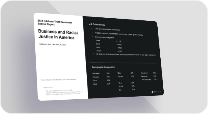 2021 Edelman Trust Barometer U.S. Online Survey Special Report • 2,000 general population respondents Business and Racial • All data is nationally representative based on age, region, gender, ethnicity Justice in America • Racial and ethnic segments White n=1,159 Black n=500 Fieldwork: April 19 – April 26, 2021 Latinx n=500 Asian* n=500 • All racial and ethnic segments are nationally representative based on age, region and gender Demographic Composition Northeast 19% Male 49% Republican 28% Midwest 23% Female 51% Democrat 44% *Asian includes Native Hawaiian and Pacific Islanders South 36% Ind./Third-party 23% West 22% 18-34 30% Margin of error: 35-54 33% • U.S. total margin of error: +/- 2.2% (n=2,000) 55+ 37% • Ethnicity-specific data margin of error: Non-Hispanic White +/- 2.9% (n=1,159); Black, Latinx, and Asian +/- 4.4% (n=500) 2