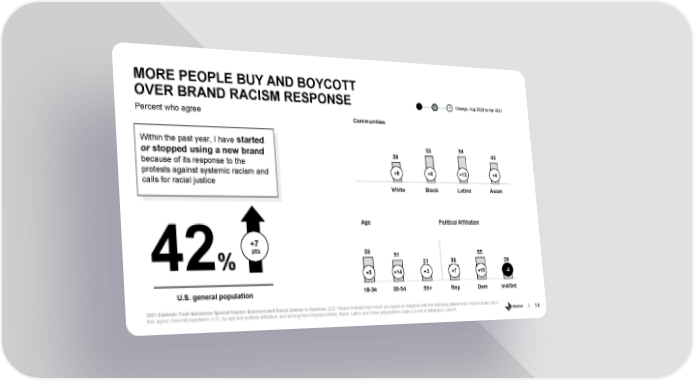 MORE PEOPLE BUY AND BOYCOTT OVER BRAND RACISM RESPONSE - 0 + Change, Aug 2020 to Apr 2021 Percent who agree Communities started Within the past year, I have 53 54 or stopped using a new brand 39 43 because of its response to the protests against systemic racism and +8 +6 +12 +4 calls for racial justice White Black Latinx Asian Age Political Affiliation +7 pts 59 51 55 42% 21 36 29 +5 +14 +3 +7 +10 -4 U.S. general population 18-34 35-54 55+ Rep Dem Ind/3rd 2021 Edelman Trust Barometer Special Report: Business and Racial Justice in America. Q23. Please indicate how much you agree or disagree with the following statements. 9-point scale; top 4 box, agree. General population, U.S., by age and political affiliation, and among Non-Hispanic White, Black, Latinx and Asian populations. Data is a net of attributes 2 and 9. 14
