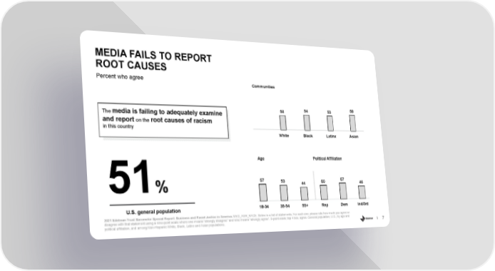 MEDIA FAILS TO REPORT ROOT CAUSES Percent who agree Communities The media is failing to adequately examine 50 54 53 58 and report on the root causes of racism in this country White Black Latinx Asian Age Political Affiliation 51% 57 53 44 50 57 46 U.S. general population 18-34 35-54 55+ Rep Dem Ind/3rd 2021 Edelman Trust Barometer Special Report: Business and Racial Justice in America. MED_AGR_RACE. Below is a list of statements. For each one, please rate how much you agree or disagree with that statement using a nine-point scale where one means “strongly disagree” and nine means “strongly agree”. 9-point scale; top 4 box, agree. General population, U.S., by age and political affiliation, and among Non-Hispanic White, Black, Latinx and Asian populations. 7