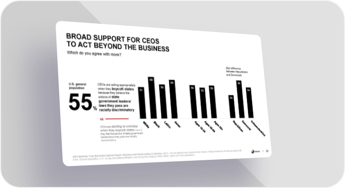 BROAD SUPPORT FOR CEOS TO ACT BEYOND THE BUSINESS Which do you agree with more? 26pt difference between Republicans and Democrats 68 64 66 U.S. general CEOs are acting appropriately 56 56 56 54 population boycott states 52 when they 51 because they believe the actions of state 40 government leaders/ 55%laws they pass are racially discriminatory VS starting to overstep CEOs are whenthey boycott states even if they feel the actions of state government leaders/laws they pass are racially discriminatory 2021 Edelman Trust Barometer Special Report: Business and Racial Justice in America. IDEAL. You are about to see a series of two choices. Please choose the one that you agree with more. General population, U.S., by age and political affiliation, and among Non-Hispanic White, Black, Latinx and Asian populations. 26