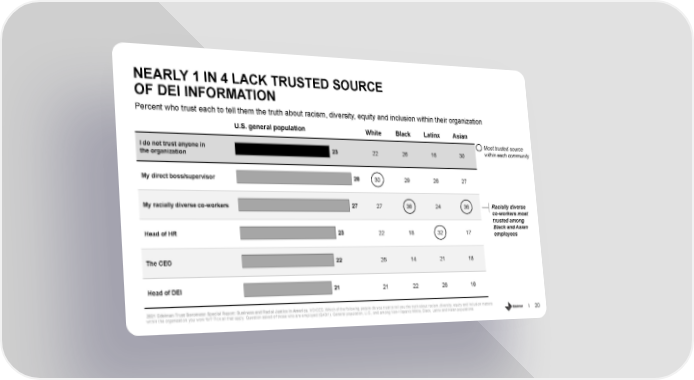 NEARLY 1 IN 4 LACK TRUSTED SOURCE OF DEI INFORMATION Percent who trust each to tell them the truth about racism, diversity, equity and inclusion within their organization U.S. general population White Black Latinx Asian I do not trust anyone in Most trusted source the organization 23 22 26 16 30 within each community My direct boss/supervisor 28 30 29 26 27 My racially diverse co-workers 27 27 36 24 36 Racially diverse co-workers most trusted among Head of HR 23 22 18 32 17 Black and Asian employees The CEO 22 28 14 21 18 Head of DEI 21 21 22 26 19 2021 Edelman Trust Barometer Special Report: Business and Racial Justice in America. VOICES. Which of the following people do you trust to tell you the truth about racism, diversity, equity and inclusion matters within the organization you work for? Pick all that apply. Question asked of those who are employed (Q43/1). General population, U.S., and among Non-Hispanic White, Black, Latinx and Asian populations. 20