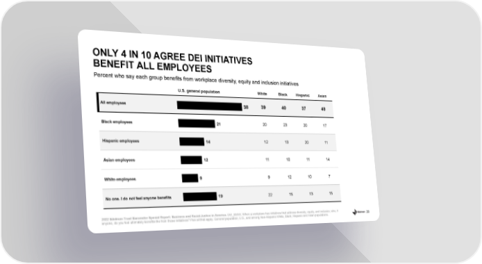 20 U.S. general population White Black Hispanic Asian All employees 39 40 37 48 Black employees 20 23 20 17 Hispanic employees 12 13 20 11 Asian employees 11 10 11 14 White employees 9 12 10 7 No one. I do not feel anyone benefits 22 15 13 15 Percent who say each group benefits from workplace diversity, equity and inclusion initiatives ONLY 4 IN 10 AGREE DEI INITIATIVES BENEFIT ALL EMPLOYEES 2022 Edelman Trust Barometer Special Report: Business and Racial Justice in America. DEI_BENE. When a workplace has initiatives that address diversity, equity, and inclusion, who, if anyone, do you feel ultimately benefits the from those initiatives? Pick all that apply. General population, U.S., and among Non -Hispanic White, Black, Hispanic and Asian populations. 19 9 12 14 21 38