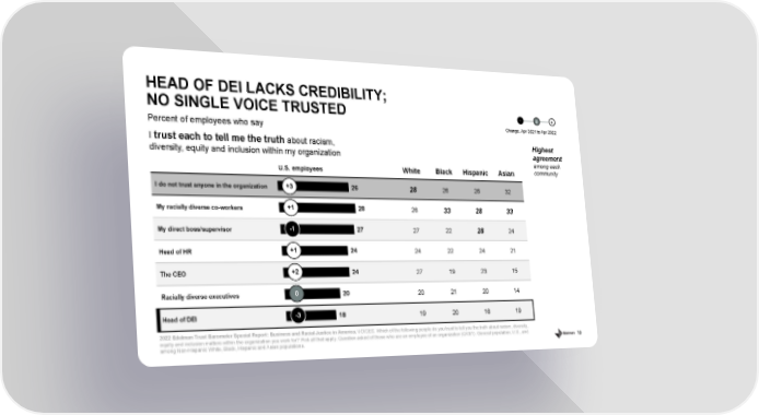19 HEAD OF DEI LACKS CREDIBILITY; NO SINGLE VOICE TRUSTED 2022 Edelman Trust Barometer Special Report: Business and Racial Justice in America. VOICES. Which of the following people do you trust to tell you the truth about racism, diversity, equity and inclusion matters within the organization you work for? Pick all that apply. Question asked of those who are an employee of an organization (Q43/1). General population, U.S., and among Non-Hispanic White, Black, Hispanic and Asian populations. U.S. employees White Black Hispanic Asian I do not trust anyone in the organization 28 26 26 32 My racially diverse co- workers 26 33 28 33 My direct boss/supervisor 27 22 28 24 Head of HR 24 22 24 21 The CEO 27 19 23 15 Racially diverse executives 20 21 20 14 Head of DEI 19 20 16 19 18 20 24 24 27 28 26 +1 -1 +2 +1 0 -3 +3 Percent of employees who say Highest agreement among each community I trust each to tell me the truth about racism, diversity, equity and inclusion within my organization Change, Apr 2021 to Apr 2022 - 0 +