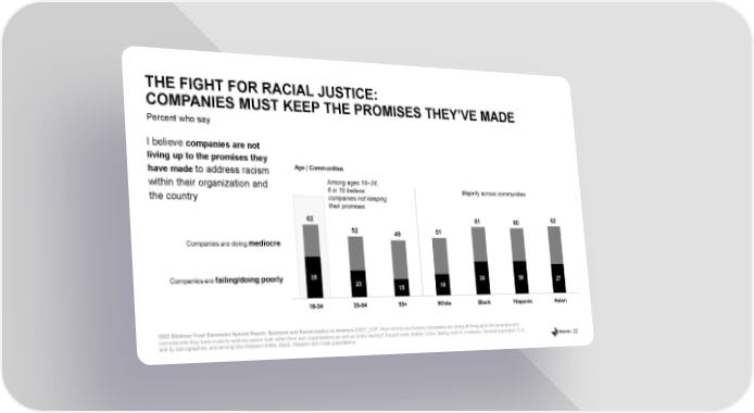 22 Percent who say THE FIGHT FOR RACIAL JUSTICE: COMPANIES MUST KEEP THE PROMISES THEY’VE MADE 2022 Edelman Trust Barometer Special Report: Business and Racial Justice in America. MEET_EXP. How well do you believe companies are doing at living up to the promises and commitments they have made to address racism both within their own organizations as well as in the country? 5-point scale; bottom 2 box, failing; code 3, mediocre. General population, U.S., and by demographics, and among Non-Hispanic White, Black, Hispanic and Asian populations. Companies are doing mediocre Companies are failing/doing poorly 35 23 15 19 30 30 27 62 52 49 51 61 60 62 18-34 35-54 55+ White Black Hispanic Asian Age | Communities I believe companies are not living up to the promises they have made to address racism within their organization and the country Among ages 18– 34, 6 in 10 believe companies not keeping their promises Majority across communities