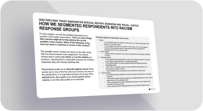 31 2022 EDELMAN TRUST BAROMETER SPECIAL REPORT: BUSINESS AND RACIAL JUSTICE HOW WE SEGMENTED RESPONDENTS INTO RACISM RESPONSE GROUPS For this analysis, we took the possible responses from a question which asked respondents: “ There are many things that a person might do to help address the racism problem in this country. Which of the following, if any, have you done in response to racism in this country?” The possible answer choices are shown on the right, along with how those answers were categorized. The answer choices shown underneath denier and on the sideline are exclusive, meaning that if a respondent chooses one of these responses, they can’t choose anything else. Respondents qualify as an advocate against racism if they answer yes to any of the four advocacy choices, but none of the activist items. If a respondent answers yes to any of the activist items, they qualify as an activist against racism, whether or not they also qualify as an advocate. Possible categories respondents could fall into: 1. Denier: • I do not believe racism is a problem in this country, so I have not personally done anything to address or fight it • I do not believe that racism is a problem in this country, and I have engaged in counter protests against people or organizations that have attempted to characterize the U.S.as a racist country. 2. On the sideline • I believe racism is a problem, but I have not personally done anything to address or fight it. 3. Advocate actions: • I have supported and participated in product and business boycotts in response to a company’s racist behavior or racist policies quartile • I have signed petitions to support specific actions and initiatives aimed at addressing racism • I have “liked” or reposted content on social media that calls attention to or discusses the problem of racism • I have donated money to groups that are committed to ending racism 4. Activist actions: • I have attended public protests or marches to oppose racist behavior, incidents, or policies • I have communicated directly to political or business leaders about what I want or expect them to do to address racism • I have campaigned for political candidates that share my views regarding the importance of ending racism • I have volunteered with organizations that are committed to fighting racism