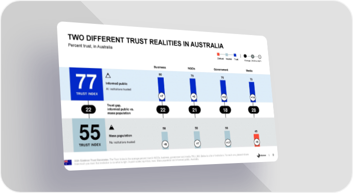 TWO DIFFERENT TRUST REALITIES IN AUSTRALIA Percent trust, in Australia - 0 + Distrust Neutral Trust Change, 2020 to 2021 Business NGOs Government Media 80 79 76 73 77 Informed public All institutions trusted TRUST INDEX +7 +5 +12 +14 Trust gap, 22 informed public vs. 22 21 18 28 mass population 58 58 58 55 Mass population 45 TRUST INDEX No institutions trusted +8 +7 +17 +9 2021 Edelman Trust Barometer. The Trust Index is the average percent trust in NGOs, business, government and media. TRU_INS. Below is a list of institutions. For each one, please indicate how much you trust that institution to do what is right. 9-point scale; top 4 box, trust. Mass population and informed public, Australia. 9