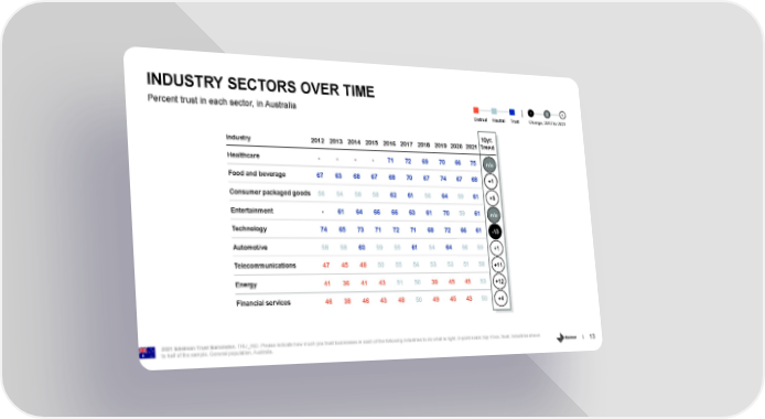 INDUSTRY SECTORS OVER TIME - 0 + Percent trust in each sector, in Australia Distrust Neutral Trust Change, 2012 to 2021 10yr. Industry 2012 2013 2014 2015 2016 2017 2018 2019 2020 2021 Trend Healthcare - - - - 71 72 69 70 66 75 n/a Food and beverage 67 63 68 67 68 70 67 74 67 68 +1 Consumer packaged goods 56 54 58 58 62 61 56 64 59 61 +5 Entertainment - 61 64 66 66 63 61 70 59 61 n/a Technology 74 65 73 71 72 71 68 72 66 61 -13 Automotive 58 58 60 59 55 61 54 64 56 59 +1 Telecommunications 47 45 48 50 55 54 53 53 51 58 +11 Energy 41 36 41 43 51 50 39 45 45 53 +12 Financial services 46 38 46 43 48 50 49 45 43 50 +4 2021 Edelman Trust Barometer. TRU_IND. Please indicate how much you trust businesses in each of the following industries to do what is right. 9-point scale; top 4 box, trust. Industries shown 13 to half of the sample. General population, Australia.