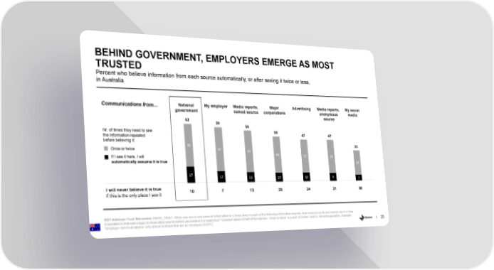 BEHIND GOVERNMENT, EMPLOYERS EMERGE AS MOST TRUSTED Percent who believe information from each source automatically, or after seeing it twice or less, in Australia National My employer Media reports, Major Advertising Media reports, My social Communications from… government named source corporations anonymous media 62 source 59 56 Nr. of times they need to see 50 47 47 the information repeated before believing it: 45 35 Once or twice 47 45 40 37 38 If I see it here, I will automatically assume it is true 28 17 12 11 10 10 9 7 I will never believe it is true 10 7 13 20 24 21 36 if this is the only place I see it 2021 Edelman Trust Barometer. HEAR_TIME1. When you see a new piece of information or a news story in each of the following information sources, how many times do you need to see it or hear it repeated in that same type of information source before you believe it is really true? Question asked of half of the sample. “Once or twice” is a sum of codes 2 and 3. General population, Australia. 25 “Employer communications” only shown to those that are an employee (Q43/1).