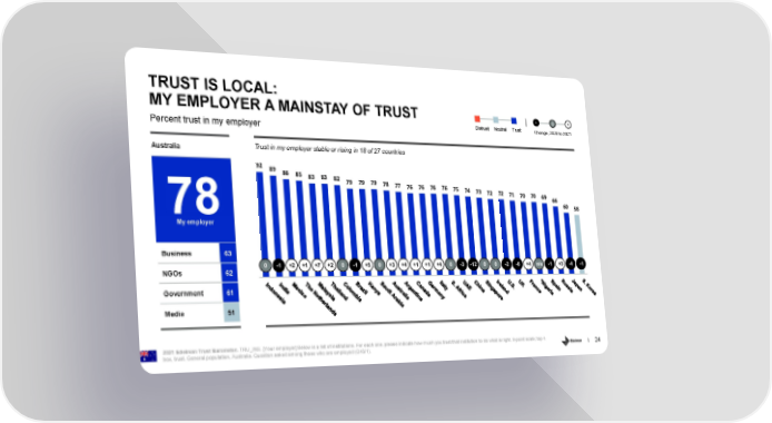 TRUST IS LOCAL: MY EMPLOYER A MAINSTAY OF TRUST - 0 + Distrust Neutral Trust Change, 2020 to 2021 Percent trust in my employer Trust in my employer stable or rising in 18 of 27 countries Australia 92 89 86 85 83 83 82 79 79 79 78 77 76 76 76 76 75 74 73 72 72 71 70 70 69 66 60 58 76% 78 My employer My employer more trusted than institutions Business 63 0 -1 +2 +1 +7 +2 0 -1 +5 0 +3 +4 +1 +1 +4 0 -3 -12 0 0 -2 -6 +4 n/a -1 +3 -4 -1 l l ll ll l ll NGOs 62 Government 61 Media 51 2021 Edelman Trust Barometer. TRU_INS. [Your employer] Below is a list of institutions. For each one, please indicate how much you trust that institution to do what is right. 9-point scale; top 4 24 box, trust. General population, Australia. Question asked among those who are employed (Q43/1).