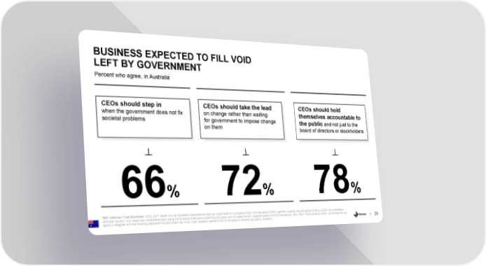 BUSINESS EXPECTED TO FILL VOID LEFT BY GOVERNMENT Percent who agree, in Australia CEOs should step in CEOs should take the lead CEOs should hold when the government does not fix on change rather than waiting themselves accountable to societal problems for government to impose change the public and not just to the on them board of directors or stockholders 66% 72% 78% 2021 Edelman Trust Barometer. CEO_EXP. Below is a list of potential expectations that you might have for a company CEO. Thinking about CEOs in general, whether they are global CEOs or a CEO who oversees a particular country, how would you characterize each using the following three-point scale? 3-point scale, sum of codes 2 and 3. Question asked of half of the sample. CEO_AGR. Thinking about CEOs, how strongly do you 23 agree or disagree with the following statement? 9-point scale; top 4 box, trust. Question asked of half of the sample. General population, Australia.