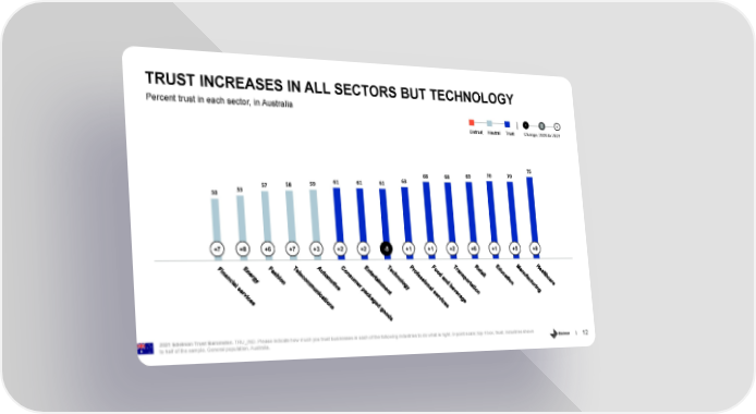 TRUST INCREASES IN ALL SECTORS BUT TECHNOLOGY Percent trust in each sector, in Australia - 0 + Distrust Neutral Trust Change, 2020 to 2021 70 70 75 68 68 69 58 59 61 61 61 63 53 57 50 +7 +8 +6 +7 +3 +2 +2 -5 +1 +1 +2 +6 +1 +5 +9 2021 Edelman Trust Barometer. TRU_IND. Please indicate how much you trust businesses in each of the following industries to do what is right. 9-point scale; top 4 box, trust. Industries shown 12 to half of the sample. General population, Australia.