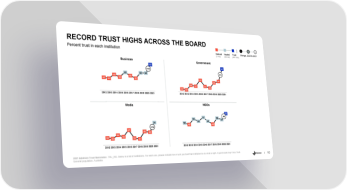 RECORD TRUST HIGHS ACROSS THE BOARD - 0 + Percent trust in each institution Distrust Neutral Trust Change, 2020 to 2021 (1-49) (50-59) (60-100) Business Government 63 61 +11 52 52 52 +17 49 48 45 44 46 45 45 44 42 38 37 37 33 35 32 2012 2013 2014 2015 2016 2017 2018 2019 2020 2021 2012 2013 2014 2015 2016 2017 2018 2019 2020 2021 Media NGOs 62 57 56 +8 55 54 51 50 52 52 48 48 +12 42 40 39 36 34 33 32 32 31 2012 2013 2014 2015 2016 2017 2018 2019 2020 2021 2012 2013 2014 2015 2016 2017 2018 2019 2020 2021 2021 Edelman Trust Barometer. TRU_INS. Below is a list of institutions. For each one, please indicate how much you trust that institution to do what is right. 9-point scale; top 4 box, trust. 10 General population, Australia.