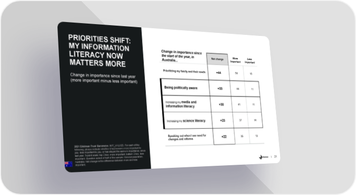 PRIORITIES SHIFT: Change in importance since MY INFORMATION More Less the start of the year, in Net change Important Important LITERACY NOW Australia... MATTERS MORE Prioritizing my family and their needs 54 10 +44 Change in importance since last year (more important minus less important) 44 11 Being politically aware +33 media and Increasing my 41 11 +30 information literacy 37 14 science literacy +23 Increasing my Speaking out when I see need for 35 13 +22 changes and reforms 2021 Edelman Trust Barometer. IMP_VALUES. For each of the following, please indicate whether it has become more important to you, less important to you, or has stayed the same in importance, since last year. 5-point scale; top 2 box; more important; bottom 2 box, less important. Question asked of half of the sample. General population, Australia. Net change is the difference between more and less 21 important.