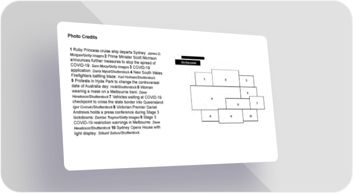 Photo Credits 1 Ruby Princess cruise ship departs Sydney: James D. Morgan/Getty Images2 Prime Minister Scott Morrison announces further measures to stop the spread of COVID-19: Sam Mooy/Getty Images 3 COVID-19 application: Daria Nipot/Shutterstock 4 New South Wales Firefighters battling blaze: Karl Hofman/Shutterstock 5 Protests in Hyde Park to change the controversial date of Australia day: Holli/Shutterstock 6 Woman wearing a mask on a Melbourne tram: Dave Hewinson/Shutterstock 7 Vehicles waiting at COVID-19 checkpoint to cross the state border into Queensland: Igor Corovic/Shutterstock 8 Victorian Premier Daniel Andrews holds a press conference during Stage 3 lockdowns: Darrian Traynor/Getty Images 9 Stage 3 COVID-19 restriction warnings in Melbourne: Dave Hewinson/Shutterstock 10 Sydney Opera House with light display: Srikant Sahoo/Shutterstock.