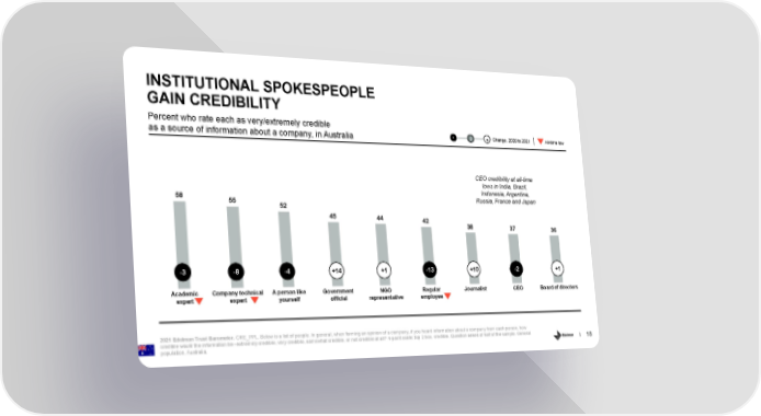 INSTITUTIONAL SPOKESPEOPLE GAIN CREDIBILITY Percent who rate each as very/extremely credible - 0 + Change, 2020 to 2021 All-time low as a source of information about a company, in Australia CEO credibility at all-time lows in India, Brazil, Indonesia, Argentina, 58 Russia, France and Japan 55 52 45 44 42 38 37 36 -3 -8 -4 +14 +1 -13 +10 -2 +1 Academic Company technical A person like Government NGO Regular Journalist CEO Board of directors expert expert yourself official representative employee 2021 Edelman Trust Barometer. CRE_PPL. Below is a list of people. In general, when forming an opinion of a company, if you heard information about a company from each person, how credible would the information be--extremely credible, very credible, somewhat credible, or not credible at all? 4-point scale; top 2 box, credible. Question asked of half of the sample. General 18 population, Australia.