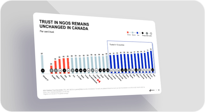 TRUST IN NGOS REMAINS UNCHANGED IN CANADA - 0 + Per cent trust Distrust Neutral Trust Change, 2020 to 2021 Trusted in 13 countries 74 78 65 65 65 67 68 69 70 59 60 61 62 64 57 51 51 52 53 55 55 56 56 46 48 49 50 40 25 -1 0 0 +3 -1 +1 0 -8 -6 -6 +3 0 +1 -3 -9 -10 +1 +7 +8 -2 -9 n/a +1 -6 0 +4 +6 +2 -2 Glo Ru Ja Ge It UK U. S. Sp Fr The Ca Ir B Co Ar S. Sa Au Tha Ch *N UAE Me In Ma Si Ke In p a S a e ra g i d n d s r l K a n la l A u s i n b an m y . i nc zi o e d i n g x o la g ia s o n N a n f t l e i n y a i a r d l m n r i ra a a r c y a a l 2 a e e d i o e s p e a b t c A nd i n t i l a s i o 7 y a he ia n a r ia ia a r rl a ab e a i nds a 2021 Edelman Trust Barometer. TRU_INS. [NGOs in general] Below is a list of institutions. For each one, please indicate how much you trust that institution to do what is right. 9-point scale; top 4 box, trust. General population, 27-mkt avg. *Nigeria not included in the global average 33