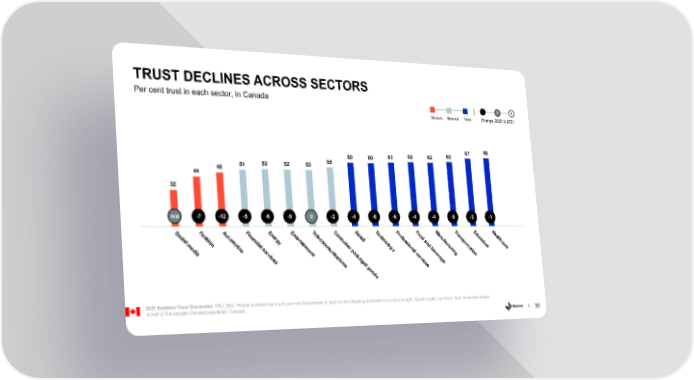 TRUST DECLINES ACROSS SECTORS Per cent trust in each sector, in Canada - 0 + Distrust Neutral Trust Change, 2020 to 2021 63 67 68 60 60 61 62 62 51 52 52 52 55 44 48 32 n/a -7 -12 -5 -6 -9 0 -2 -4 -8 -6 -4 -4 -5 -3 -1 So Fa Au Fina En En Te Co Re Te Pr Food Ma Tra Ed He c s t e t l n t c o u a i hi o r e e s a hno f n ns c l a m nc g r c i e u t l on y t om u l s a fa por a h a m s t c m o ia i nd c i n l i o a t e og o e i l m tu n r d v s m r n be ta e i e e e u p y a ri t a r ni l n i v n a v on i t c c s e g c a k er r e t a v a s ions g i ge e c d e goo s ds 2021 Edelman Trust Barometer. TRU_IND. Please indicate how much you trust businesses in each of the following industries to do what is right. 9-point scale; top 4 box, trust. Industries shown to half of the sample. General population, Canada. 35