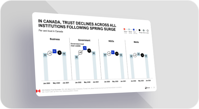 IN CANADA, TRUST DECLINES ACROSS ALL INSTITUTIONS FOLLOWING SPRING SURGE Distrust Neutral Trust - 0 + (1-49) (50-59) (60-100) Change, wave to wave Per cent trust in Canada Business Government NGOs Media Government trust most volatile 70 61 -11 61 +8 -5 56 +20 59 +6 -6 58 53 55 55 53 +5 -4 54 50 Jan 2020 May 2020 Jan 2021 Jan 2020 May 2020 Jan 2021 Jan 2020 May 2020 Jan 2021 Jan 2020 May 2020 Jan 2021 2021 Edelman Trust Barometer. TRU_INS. Below is a list of institutions. For each one, please indicate how much you trust that institution to do what is right. 9-point scale; top 4 box, trust. General population, Canada. 7