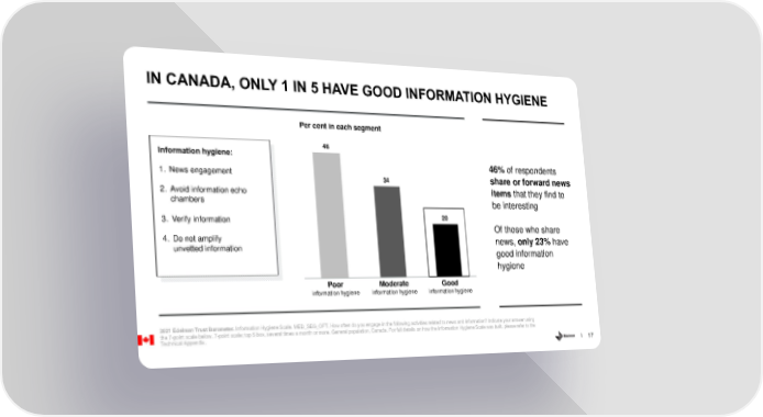 IN CANADA, ONLY 1 IN 5 HAVE GOOD INFORMATION HYGIENE Per cent in each segment 46 Information hygiene: 46% of respondents 1. News engagement 34 share or forward news 2. Avoid information echo items that they find to chambers be interesting 3. Verify information 20 Of those who share 4. Do not amplify news, only 23% have unvetted information good information hygiene Poor Moderate Good information hygiene information hygiene information hygiene 2021 Edelman Trust Barometer. Information Hygiene Scale. MED_SEG_OFT. How often do you engage in the following activities related to news and information? Indicate your answer using the 7-point scale below. 7-point scale; top 5 box, several times a month or more. General population, Canada. For full details on how the Information Hygiene Scale was built, please refer to the Technical Appendix. 17