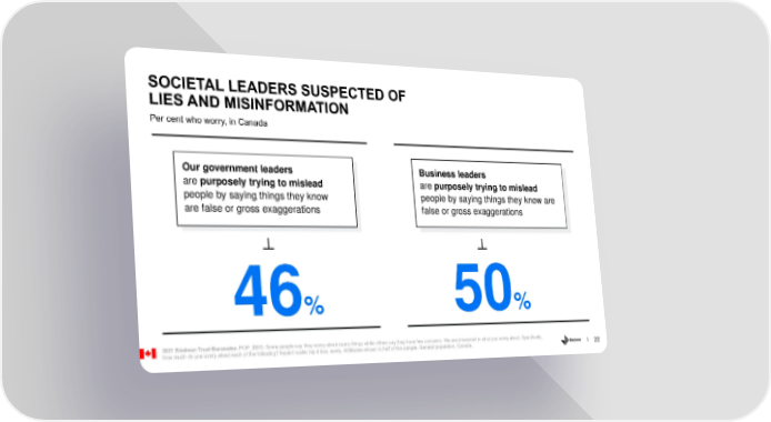 SOCIETAL LEADERS SUSPECTED OF LIES AND MISINFORMATION Per cent who worry, in Canada Our government leaders Business leaders are purposely trying to mislead are purposely trying to mislead people by saying things they know people by saying things they know are are false or gross exaggerations false or gross exaggerations 46% 50% 2021 Edelman Trust Barometer. POP_EMO. Some people say they worry about many things while others say they have few concerns. We are interested in what you worry about. Specifically, how much do you worry about each of the following? 9-point scale; top 4 box, worry. Attributes shown to half of the sample. General population, Canada. 22