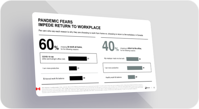 PANDEMIC FEARS IMPEDE RETURN TO WORKPLACE Per cent who say each reason is why they are choosing to work from home vs. choosing to return to the workplace, in Canada to work at home return to the office choosing , choosing to , 60%for the following reasons: 40%for the following reasons: COVID-19 risk 51 My employer made me feel safe 35 while commuting/in office (net) I am more productive 21 I am more productive 44 Enhanced work-life balance 35 Healthy work-life balance 20 2021 Edelman Trust Barometer. WRK_CHOICE. Which of the following best describes your current working situation? Question asked of those who are an employee (Q43/1). Data among employees that have a choice of working from home or their workplace. WHY_HOME. Why are you choosing to continue working from home even though you could return to the workplace if you wanted to? Select all that apply. Question asked of employees that are choosing to work from home (Q43/1 AND WRK_CHOICE/3). WHY_OFFICE. Why are you choosing to work at an office or other workplace even though you could work remotely if you wanted to? Select all that apply. Question asked of employees that are choosing to return to their workplace (Q43/1 AND WRK_CHOICE/4). General population, Canada. COVID-19 risk while commuting / in office is a net of WHY_HOME/2-3. 12