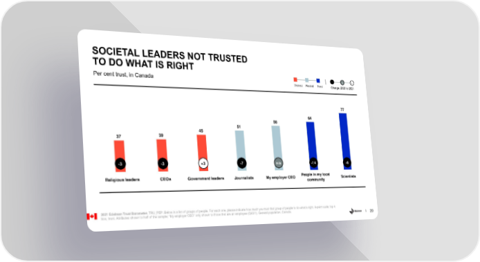 SOCIETAL LEADERS NOT TRUSTED TO DO WHAT IS RIGHT Per cent trust, in Canada - 0 + Distrust Neutral Trust Change, 2020 to 2021 77 64 58 51 45 37 39 -3 -3 +3 -7 n/a -14 -6 Religious leaders CEOs Government leaders Journalists My employer CEO People in my local Scientists community 2021 Edelman Trust Barometer. TRU_PEP. Below is a list of groups of people. For each one, please indicate how much you trust that group of people to do what is right. 9-point scale; top 4 box, trust. Attributes shown to half of the sample; “My employer CEO” only shown to those that are an employee (Q43/1). General population, Canada. 20