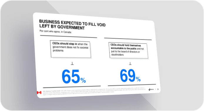BUSINESS EXPECTED TO FILL VOID LEFT BY GOVERNMENT Per cent who agree, in Canada CEOs should step in when the CEOs should hold themselves government does not fix societal accountable to the public and not problems just to the board of directors or stockholders 65% 69% 2021 Edelman Trust Barometer. CEO_EXP. Below is a list of potential expectations that you might have for a company CEO. Thinking about CEOs in general, whether they are global CEOs or a CEO who oversees a particular country, how would you characterize each using the following three-point scale? 3-point scale, sum of codes 2 and 3. Question asked of half of the sample. CEO_AGR. Thinking about CEOs, how strongly do you agree or disagree with the following statement? 9-point scale; top 4 box, trust. Question asked of half of the sample. General population, Canada. 24