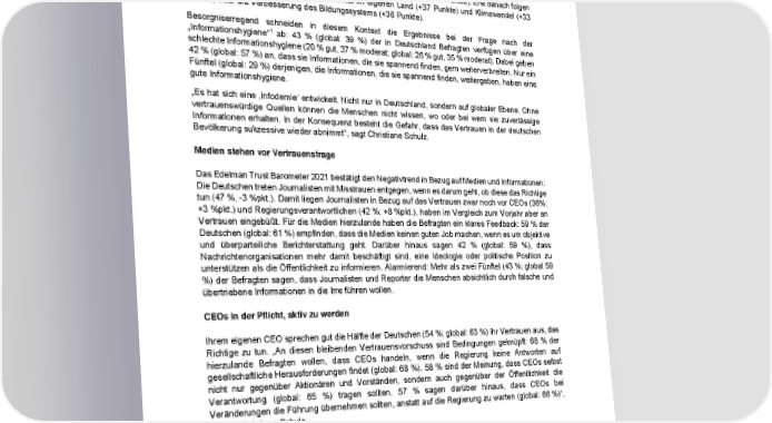 Sorge vor Falschinformationen ist fundamentale Herausforderung Die Ergebnisse des Edelman Trust Barometer 2021 zeigen, dass sich die Bedürfnisse der Menschen in der Pandemie fundamental verändert haben. Die Deutschen legen aktuell deutlich mehr Wert auf den Kampf gegen Falschinformationen als noch im vergangenen Jahr (+39 Punkte). Erst danach folgen unter anderem die Thematisierung von Armut im eigenen Land (+37 Punkte) und Klimawandel (+33 Punkte) oder die Verbesserung des Bildungssystems (+36 Punkte). Besorgniserregend schneiden in diesem Kontext die Ergebnisse bei der Frage nach der 1 „Informationshygiene“ ab: 43 % (global: 39 %) der in Deutschland Befragten verfügen über eine schlechte Informationshygiene (20 % gut, 37 % moderat; global: 26 % gut, 35 % moderat). Dabei geben 42 % (global: 57 %) an, dass sie Informationen, die sie spannend finden, gern weiterverbreiten. Nur ein Fünftel (global: 29 %) derjenigen, die Informationen, die sie spannend finden, weitergeben, haben eine gute Informationshygiene. „Es hat sich eine ‚Infodemie‘ entwickelt. Nicht nur in Deutschland, sondern auf globaler Ebene. Ohne vertrauenswürdige Quellen können die Menschen nicht wissen, wo oder bei wem sie zuverlässige Informationen erhalten. In der Konsequenz besteht die Gefahr, dass das Vertrauen in der deutschen Bevölkerung sukzessive wieder abnimmt“, sagt Christiane Schulz. Medien stehen vor Vertrauensfrage Das Edelman Trust Barometer 2021 bestätigt den Negativtrend in Bezug auf Medien und Informationen: Die Deutschen treten Journalisten mit Misstrauen entgegen, wenn es darum geht, ob diese das Richtige tun (47 %, -3 %pkt.). Damit liegen Journalisten in Bezug auf das Vertrauen zwar noch vor CEOs (36%; +3 %pkt.) und Regierungsverantwortlichen (42 %; +8 %pkt.), haben im Vergleich zum Vorjahr aber an Vertrauen eingebüßt. Für die Medien hierzulande haben die Befragten ein klares Feedback: 59 % der Deutschen (global: 61 %) empfinden, dass die Medien keinen guten Job machen, wenn es um objektive und überparteiliche Berichterstattung geht. Darüber hinaus sagen 42 % (global: 59 %), dass Nachrichtenorganisationen mehr damit beschäftigt sind, eine Ideologie oder politische Position zu unterstützen als die Öffentlichkeit zu informieren. Alarmierend: Mehr als zwei Fünftel (43 %; global 59 %) der Befragten sagen, dass Journalisten und Reporter die Menschen absichtlich durch falsche und übertriebene Informationen in die Irre führen wollen. CEOs in der Pflicht, aktiv zu werden Ihrem eigenen CEO sprechen gut die Hälfte der Deutschen (54 %; global: 63 %) ihr Vertrauen aus, das Richtige zu tun. „An diesen bleibenden Vertrauensvorschuss sind Bedingungen geknüpft: 68 % der hierzulande Befragten wollen, dass CEOs handeln, wenn die Regierung keine Antworten auf gesellschaftliche Herausforderungen findet (global: 68 %). 58 % sind der Meinung, dass CEOs selbst nicht nur gegenüber Aktionären und Vorständen, sondern auch gegenüber der Öffentlichkeit die Verantwortung (global: 65 %) tragen sollten. 57 % sagen darüber hinaus, dass CEOs bei Veränderungen die Führung übernehmen sollten, anstatt auf die Regierung zu warten (global: 66 %)“, betont Christiane Schulz. „Gerade erleben wir ein besonderes Vertrauensmomentum, auf dem es aufzubauen gilt“, fasst Christiane Schulz zusammen. „Vertrauen entsteht, wenn Ethik und Kompetenz gleichermaßen zusammenkommen. Für alle Institutionen kommt es jetzt darauf an, den Worten Taten folgen zu lassen, 1 Die Frage nach der Informationshygiene bewertet, wie die Befragten bei den folgenden vier Dimensionen abschneiden: Regelmäßige Beschäftigung mit Nachrichten, Auseinandersetzung mit unterschiedlichen Standpunkten, Überprüfung von Informationen und das Vermeiden der Verbreitung von Falschinformationen 2