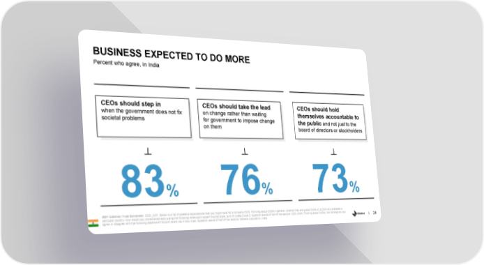 BUSINESS EXPECTED TO DO MORE Percent who agree, in India CEOs should step in CEOs should take the lead CEOs should hold when the government does not fix on change rather than waiting themselves accountable to societal problems for government to impose change the public and not just to the on them board of directors or stockholders 83% 76% 73% 2021 Edelman Trust Barometer. CEO_EXP. Below is a list of potential expectations that you might have for a company CEO. Thinking about CEOs in general, whether they are global CEOs or a CEO who oversees a particular country, how would you characterize each using the following three-point scale? 3-point scale, sum of codes 2 and 3. Question asked of half of the sample. CEO_AGR. Thinking about CEOs, how strongly do you 24 agree or disagree with the following statement? 9-point scale; top 4 box, trust. Question asked of half of the sample. General population, India.