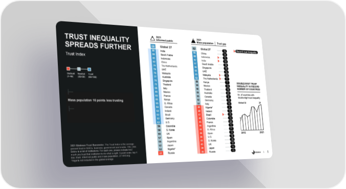 2021 2021 Informed public Mass population Trust gap TRUST INEQUALITY 68 Global 27 52 Global 27 Record trust inequality 16 SPREADS FURTHER 86 India 68 China 14 86 Saudi Arabia 68 Indonesia 15 Trust Index 83 Indonesia 67 India 19 82 China 67 Saudi Arabia 19 79 The Netherlands 66 Singapore 10 79 UAE 65 14 UAE 78 Malaysia 63 15 Malaysia Distrust Neutral Trust 77 Australia 62 17 The Netherlands (1-49) (50-59) (60-100) 76 Singapore 58 7 Kenya DOUBLE-DIGIT TRUST 75 Thailand 56 10 INEQUALITY IN RECORD Mexico NUMBER OF COUNTRIES 66 Italy 56 19 Thailand 66 Mexico 55 22 Australia Nr. of countries with 65 France 55 9 Canada double-digit trust inequality 65 Kenya 52 10 Germany Mass population 16 points less trusting Global 22 21 65 S. Africa 51 15 Italy 64 Canada 49 3 Nigeria* 63 Ireland 48 15 Ireland 62 Brazil 47 15 Brazil 62 Germany 46 13 Colombia 7 62 U.S. 45 20 France 59 Colombia 44 12 Argentina 59 S. Korea 44 21 S. Africa 13 59 UK 44 Spain 2012 2021 18 57 Spain 44 U.S. 16 56 Argentina 43 S. Korea 2021 Edelman Trust Barometer. The Trust Index is the average 16 52 Japan 43 percent trust in NGOs, business, government and media. TRU_INS. UK Below is a list of institutions. For each one, please indicate how 13 52 Nigeria* 39 Japan much you trust that institution to do what is right. 9-point scale; top 4 13 41 Russia 28 Russia box, trust. Informed public and mass population, 27-mkt avg. 5 *Nigeria not included in the global average