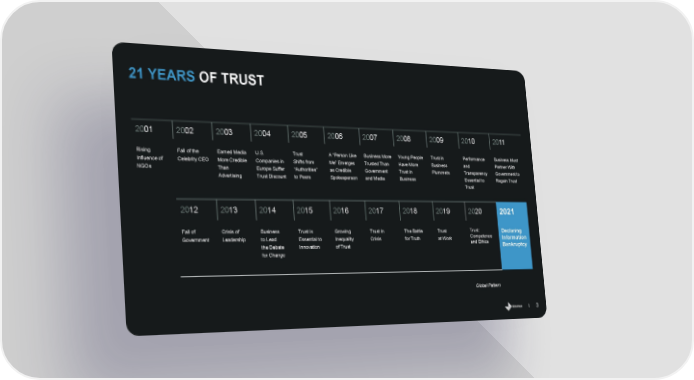 21 YEARS OF TRUST 2001 2002 2003 2004 2005 2006 2007 2008 2009 2010 2011 Rising Fall of the Earned Media U.S. Trust A “Person Like Business More Young People Trust in Performance Business Must Influence of Celebrity CEO More Credible Companies in Shifts from Me” Emerges Trusted Than Have More Business and Partner With NGOs Than Europe Suffer “Authorities” as Credible Government Trust in Plummets Transparency Government to Advertising Trust Discount to Peers Spokesperson and Media Business Essential to Regain Trust Trust 2012 2013 2014 2015 2016 2017 2018 2019 2020 2021 Trust: Fall of Crisis of Business Trust is Growing Trust in The Battle Trust Declaring Competence Government Leadership to Lead Essential to Inequality Crisis for Truth at Work Information and Ethics the Debate Innovation of Trust Bankruptcy for Change Global Pattern 3