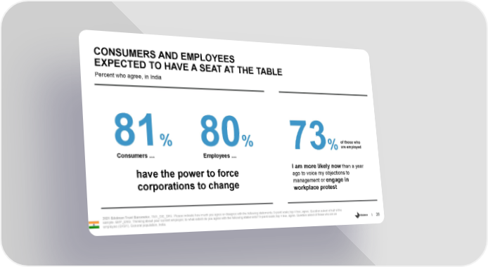 CONSUMERS AND EMPLOYEES EXPECTED TO HAVE A SEAT AT THE TABLE Percent who agree, in India of those who 81% 80% are employed 73% Consumers … Employees … I am more likely now than a year ago to voice my objections to have the power to force management or engage in corporations to change workplace protest 2021 Edelman Trust Barometer. TMA_SIE_SHV. Please indicate how much you agree or disagree with the following statements. 9-point scale; top 4 box, agree. Question asked of half of the sample. EMP_ENG. Thinking about your current employer, to what extent do you agree with the following statements? 9-point scale; top 4 box, agree. Question asked of those who are an 26 employee (Q43/1). General population, India.