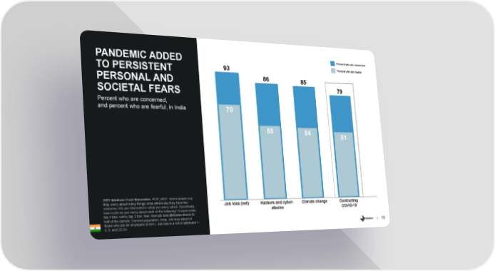 Percent who are concerned PANDEMIC ADDED Percent who are fearful 93 TO PERSISTENT 86 85 PERSONAL AND 79 SOCIETAL FEARS Percent who are concerned, and percent who are fearful, in India 70 55 54 51 2021 Edelman Trust Barometer. POP_EMO. Some people say they worry about many things while others say they have few Job loss (net) Hackers and cyber- Climate change Contracting concerns. We are interested in what you worry about. Specifically, how much do you worry about each of the following? 9-point scale; attacks COVID-19 top 4 box, worry; top 2 box, fear. Non-job loss attributes shown to half of the sample. General population, India. Job loss asked of those who are an employee (Q43/1). Job loss is a net of attributes 1- 16 3, 5, and 22-24.