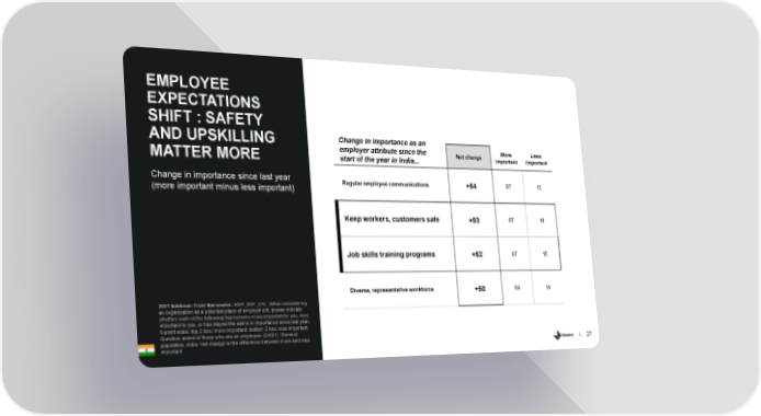 EMPLOYEE EXPECTATIONS SHIFT : SAFETY Change in importance as an AND UPSKILLING More Less employer attribute since the Net change Important Important start of the year in India... MATTER MORE Change in importance since last year Regular employee communications 67 13 +54 (more important minus less important) Keep workers, customers safe 67 14 +53 Job skills training programs 67 15 +52 Diverse, representative workforce 64 14 +50 2021 Edelman Trust Barometer. EMP_IMP_VAL. When considering an organization as a potential place of employment, please indicate whether each of the following has become more important to you, less important to you, or has stayed the same in importance since last year. 5-point scale; top 2 box; more important; bottom 2 box, less important. Question asked of those who are an employee (Q43/1). General population, India. Net change is the difference between more and less 27 important.