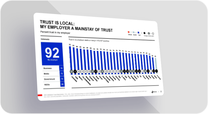 TRUST IS LOCAL: MY EMPLOYER A MAINSTAY OF TRUST - 0 + Distrust Neutral Trust Change, 2020 to 2021 Percent trust in my employer Trust in my employer stable or rising in 18 of 27 countries Indonesia 92 89 86 85 83 83 82 79 79 79 78 77 76 76 76 76 75 74 73 72 72 71 70 70 69 66 60 58 76% 92 My employer My employer more trusted than institutions Business 78 0 -1 +2 +1 +7 +2 0 -1 +5 0 +3 +4 +1 +1 +4 0 -3 -12 0 0 -2 -6 +4 n/a -1 +3 -4 -1 l l ll ll l ll Media 72 Government 70 NGOs 68 2021 Edelman Trust Barometer. TRU_INS. [Your employer] Below is a list of institutions. For each one, please indicate how much you trust that institution to do what is right. 9-point scale; top 4 22 box, trust. General population, Indonesia. Question asked among those who are employed (Q43/1).