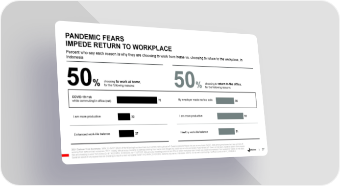 PANDEMIC FEARS IMPEDE RETURN TO WORKPLACE Percent who say each reason is why they are choosing to work from home vs. choosing to return to the workplace, in Indonesia to work at home return to the office choosing , choosing to , 50%for the following reasons: 50%for the following reasons: COVID-19 risk My employer made me feel safe 75 35 while commuting/in office (net) I am more productive I am more productive 22 51 Enhanced work-life balance 27 Healthy work-life balance 31 2021 Edelman Trust Barometer. WRK_CHOICE. Which of the following best describes your current working situation? Question asked of those who are an employee (Q43/1). Data among employees that have a choice of working from home or their workplace. WHY_HOME. Why are you choosing to continue working from home even though you could return to the workplace if you wanted to? Select all that apply. Question asked of employees that are choosing to work from home (Q43/1 AND WRK_CHOICE/3). WHY_OFFICE. Why are you choosing to work at an office or other workplace even though you could work remotely if you wanted to? Select all that apply. 27 Question asked of employees that are choosing to return to their workplace (Q43/1 AND WRK_CHOICE/4). General population, Indonesia. COVID-19 risk while commuting / in office is a net of WHY_HOME/2-3.