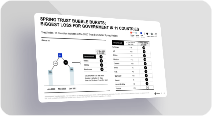 SPRING TRUST BUBBLE BURSTS; BIGGEST LOSS FOR GOVERNMENT IN 11 COUNTRIES - 0 + Distrust Neutral Trust Change, wave to wave Trust Index, 11 countries included in the 2020 Trust Barometer Spring Update (1-49) (50-59) (60-100) +/- Jan 2020 to +/- May 2020 to Government Global 11 May 2020 Jan 2021 S. Korea -17 +16 -17 UK -15 +/- May 2020 +24 -15 to Jan 2021 China -13 61 +5 -13 Government -8 -8 Mexico -12 +12 -12 Media -6 -6 -5 Canada -11 +20 -11 +6 NGOs -6 -6 India +6 -8 -8 56 Business -3 -3 U.S. -6 55 +9 -6 Government was the most Germany -5 +19 -5 trusted institution in May, then lost its lead 6 months later Japan -1 -5 -1 Saudi Arabia -1 +5 -1 Jan 2020 May 2020 Jan 2021 France +2 +13 2 2021 Edelman Trust Barometer. The Trust Index is the average percent trust in NGOs, business, government and media. TRU_INS. Below is a list of institutions. For each one, please indicate 5 how much you trust that institution to do what is right. 9-point scale; top 4 box, trust. General population, 11-mkt avg.