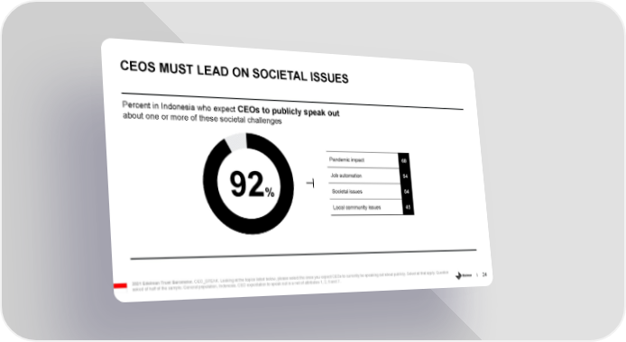 CEOS MUST LEAD ON SOCIETAL ISSUES Percent in Indonesia who expect CEOs to publicly speak out about one or more of these societal challenges Pandemic impact 68 Job automation 54 Societal issues 54 92% Local community issues 45 2021 Edelman Trust Barometer. CEO_SPEAK. Looking at the topics listed below, please select the ones you expect CEOs to currently be speaking out about publicly. Select all that apply. Question 24 asked of half of the sample. General population, Indonesia. CEO expectation to speak out is a net of attributes 1, 2, 5 and 7.