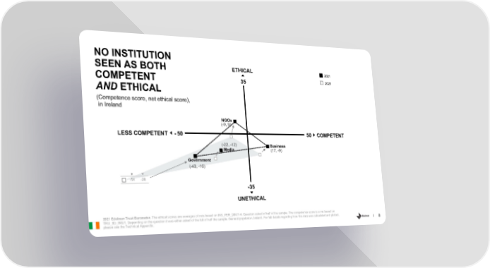 NO INSTITUTION SEEN AS BOTH ETHICAL 2021 COMPETENT 35 2020 ANDETHICAL (Competence score, net ethical score), in Ireland NGOs (-9, 9) LESS COMPETENT -50 50 COMPETENT (-22, -12) Business Media (17, -9) Government (-43, -16) X Y -54 -28 -35 UNETHICAL 2021 Edelman Trust Barometer. The ethical scores are averages of nets based on INS_PER_DIM/1-4. Question asked of half of the sample. The competence score is a net based on TRU_3D_INS/1. Depending on the question it was either asked of the full of half the sample. General population, Ireland. For full details regarding how this data was calculated and plotted, 8 please see the Technical Appendix.