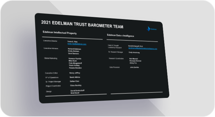 2021 EDELMAN TRUST BAROMETER TEAM Edelman Intellectual Property Edelman Data x Intelligence Executive Director Tonia E. Ries tonia.ries@edelman.com Head of Thought David M. Bersoff, Ph.D. Leadership Research david.bersoff@edelmandataxintelligence.com Executive Advisors Richard Edelman Kirsty Graham Sr. Research Manager Cody Armstrong Dave Samson Global Marketing Vanessa Pymble Research Coordinators Nick Maxwell Mike Bush Giuseppe Bovenzi Polly Mingledorff Abbey Fox Thom Holiday Data Processor John Zamites Pamela Blandon Executive Editor Nancy Jeffrey VP of Operations Sarah Adkins Sr. Project Manager Esther Choi Project Coordinator Chloe Buckley Design David Sookochoff Brad Good
